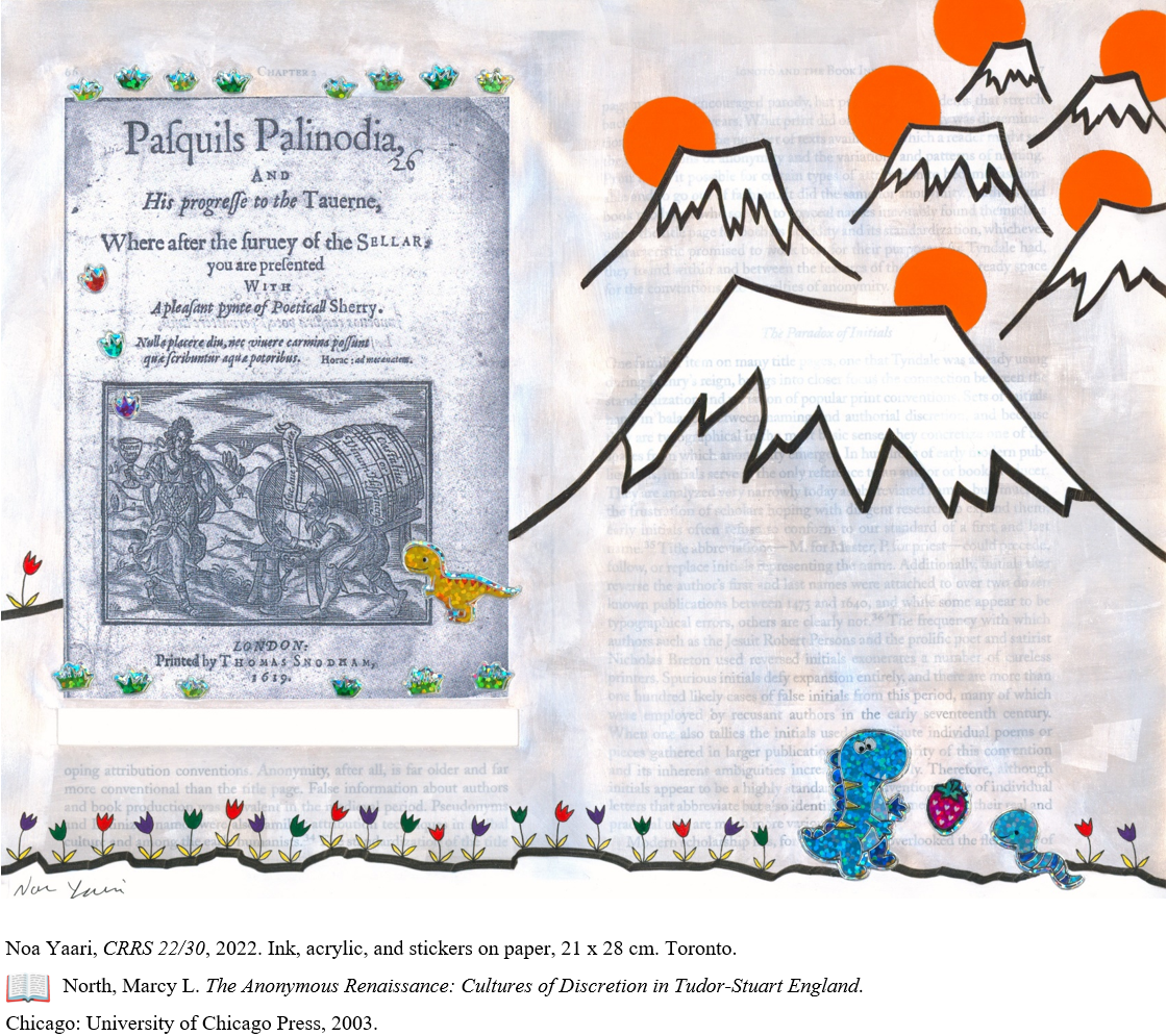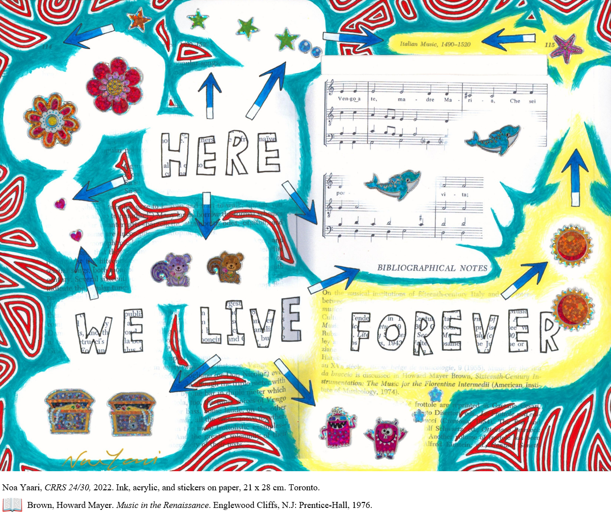 Dr. Noa Yaari is an artist and art-based knowledge broker. In her work, she explores combinations of words and images in academic, artistic, and daily practices. She holds a PhD in History and MA in Humanities from York University, and an MA in History and Philosophy of Science and Ideas (magna cum laude) from Tel Aviv University. In addition to her solo exhibition at the CJS, she is currently working on an art installation at the Centre for Renaissance and Reformation Studies at the University of Toronto, in which she is a Fellow. Both projects practice art-based knowledge mobilization as well as community building and placemaking on campus.