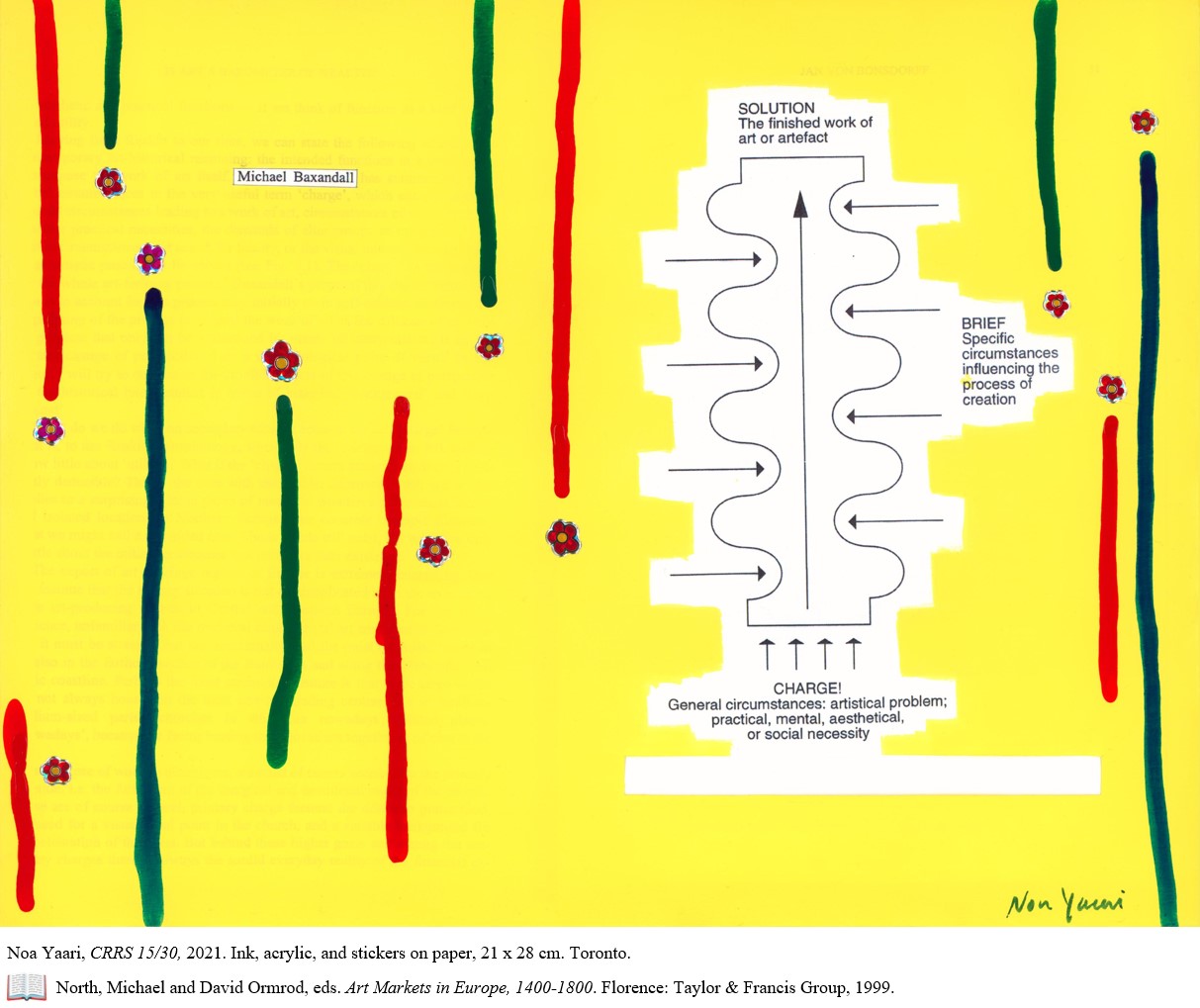 I painted on pages 30-31 in Jan von Bonsdorff’s article “Is Art a Barometer of Wealth? Medieval Art Exports to the Far North of Europe,” where he pointed out the problem of conducting historical research without sources outside of the artwork and visualized Baxandall’s model.