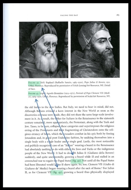 In implicit MFRs, the pulling and pushing forces between the verbal and the visual poles are mostly based on the semantic and the visual similarity between words in the main text and words in the caption, rather than on the convention “(Fig. 1).” It should be noted that when we discuss the verbal and visual poles, as the two ends of an implicit MFR, the visual pole may be specific words in the caption, rather than purely the image. This condition, however, might change as the reading of the MFA continues, and an association between the words in the main text and the image is established. For example, as often happens, titles of portraits are the names of the people who are depicted in them; therefore, when authors discuss the depicted figures in the main text, they inevitably mention the titles of the portraits. In the image below, the titles of the two portraits are written in the captions of the two illustrations, as well as twice in the main text. Thus, “Julius II” and “Clement VII” in the captions, on the one hand, and in the main text, on the other, create poles between which pulling and pushing forces take place. My assumption is that when the two names are mentioned in the main text the second time, the readers find it easier to associate these names directly with the images. However, since in our example one caption is below the other, this association might take longer. At any rate, the semantic and the visual similarity between the names in the main text and the names in the captions, constitute pulling and pushing forces that enable readers to navigate throughout the MFA.
