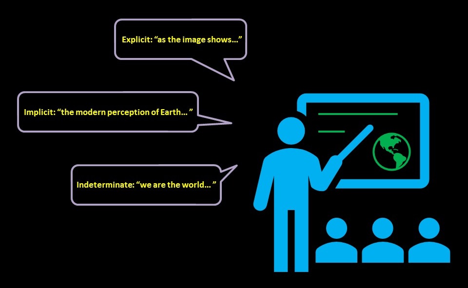 How do speakers who use both words and images employ MFG? And how can they do so intentionally and effectively? As you can see in the illustration below, the speaker refers to the image on the screen in three different ways. These are three types of multiform references (MFRs) that integrate words and images into a unified meaning. The first MFR is an explicit one, in which the speaker refers to the image directly and overtly by saying: “as the image shows…” When the audience hears this phrase, it knows that anything that will be said afterward will address what the image on the screen represents in the eyes of the speaker. By using an explicit MFR, the speaker develops a clear expectation among the audience and, consequently, enables it to agree or disagree with the speaker’s multiform argument (MFA).