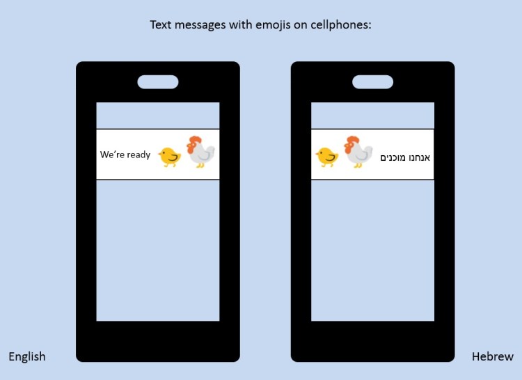 Does the fact that English is written from left to right and Hebrew from right to left influence the meaning of messages that use emojis? The illustration below shows a message in English and another in Hebrew that, on the surface, convey the same meaning: “we’re ready.” The two also use emojis at the end of or after their verbal component. Since the two languages progress in opposite directions, in English, the chick and the hen look toward the text, which is left to them, while in Hebrew, they look toward an empty or undefined space while the text is right to them.
