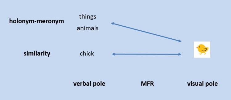 There is also a semantic relationship between the terms “things” and “animals” and the image of the chick. This is due to the inclusion of the term “chick” in these two broad terms (chick is both an animal and a thing), and due to the semantic similarity between the term “chick” and the image of the chick. Put differently, the fact that the term “chick” is a member in the groups “animals” and “things” makes the image of the chick a member in them as well. This relationship is the holonym-meronym one, where the group or whole is a holonym to the member or part, which in turn, is the meronym to the group or the whole. In the illustration above, we see a scheme of a holonym-meronym MFR, where the verbal pole, i.e., the term “things” or “animals” is a holonym to the image of the chick.