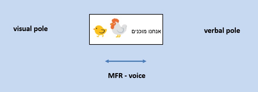 To better understand the impact of the direction of the text on the meaning of the messages, I offer to define the relationship between their verbal and visual poles, i.e., their MFR as voice. In our example, we consider the chick and the hen (the visual pole) as the source and communicator of “we’re ready” (the verbal pole). We do so due to the spatial vicinity of the two poles and the fact that we don’t see any other source for that phrase. Thus, we add a third MFR to describe the relationship between the two poles, which suggests that one voices the other.